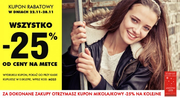 Marka odzieżowa Moodo zachęca do skorzystania z najnowszej promocji. Każdy kto wydrukuje kupon rabatowy i pokaże go przy kasie otrzyma zniżkę – 25% od ceny na metce na cały asortyment sklepu.