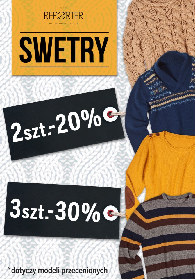 Szaleństwo wyprzedaży w sklepach Reporter wciąż trwa! Teraz na dwa swetry dostaniesz -20% rabatu, na trzy aż – 30%.