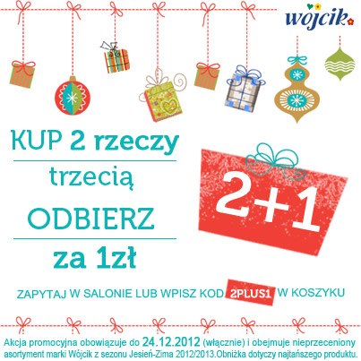 Świątecznych promocji ciąg dalszy! Tym razem w sklepach Wójcik możecie skorzystać z promocji „2+1”, czyli co trzecia rzecz za 1 zł.