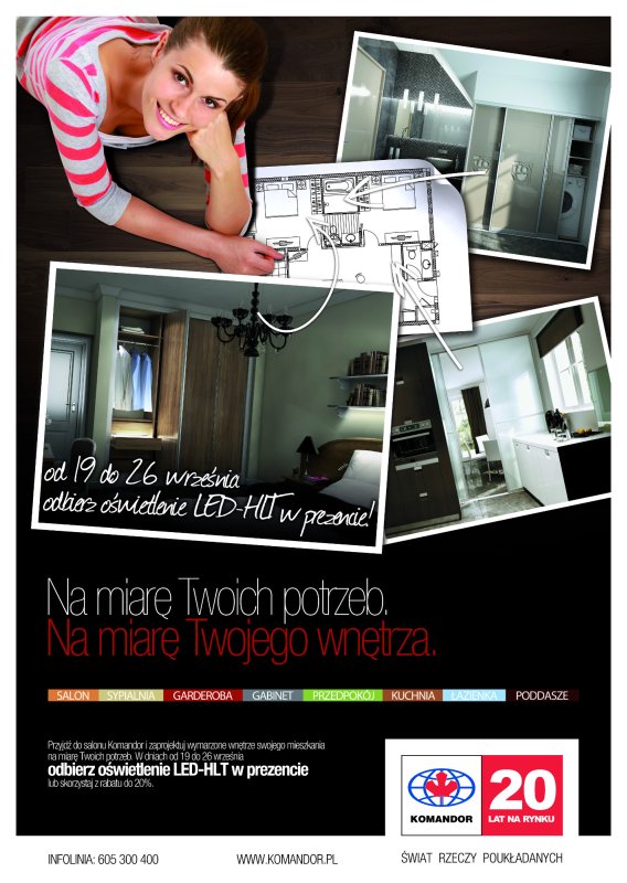 Ogólnopolska akcja promocyjna firmy Komandor, organizowana we współpracy z dostawcą materiałów oświetleniowych do mebli – firmą HLT, ruszyła 19 września. Bogata oferta mebli Komandor pozwoli klientom wybrać funkcjonalne i estetyczne wyposażenie dostosowane do każdego wnętrza – zarówno urządzonego w stylu nowoczesnym, jak i tradycyjnym.