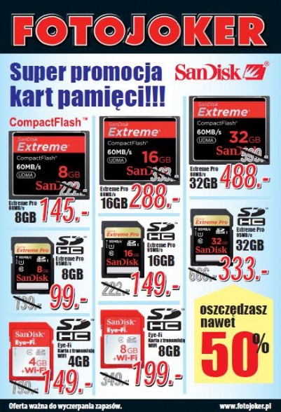 Salony marki Fotojoker przygotowały dla swoich klientów promocje kart pamięci. W atrakcyjnych cenach dostępne są aparaty firmy SanDisk.