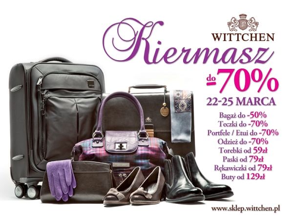 Marzec to miesiąc, w którym odświeżamy garderobę po zimie. Na kiermaszu WITTCHEN można ubrać się od stóp do głów. Słynące z nieocenionej wygody buty WITTCHEN kupimy już za 129 zł. Większość modeli została przeceniona o 50%. Paniom na pewno spodoba się szeroki wybór skórzanych pasków i rękawiczek za 79 zł. Ocieplane, z futerkiem, krótkie i długie, samochodowe i bez palców, słowem wszystkie modele rękawiczek za 79 zł. Na wyprzedaży nie może zabraknąć damskich torebek – ich ceny zostały obniżone nawet o 70%. Torebki z młodzieżowej linii Young z wykończeniem ze skóry dostaniemy już za 59 zł. Za pół ceny nabędziemy też ozdobne apaszki dla Pań i klasyczne, długie parasole dla Panów. W ten sposób skompletujemy całą, wiosenną garderobę.