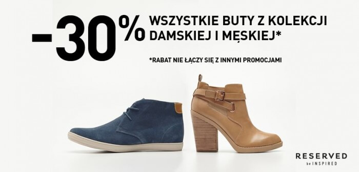 Od dzisiaj do odwołania wszystkie modele obuwia Reserved można kupić 30% taniej. Promocja obowiązuje w salonach stacjonarnych oraz e -sklepie.