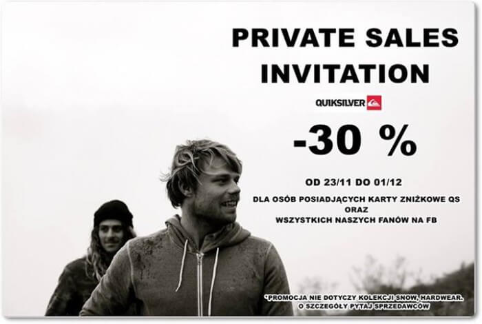 Osoby posiadające karty zniżkowe oraz fani Quicksilver na Facebooku mogą skorzystać z oferty promocyjnej. Od 23 listopada do 1 grudnia wybrany asortyment sklepu objęty będzie 30% rabatem.