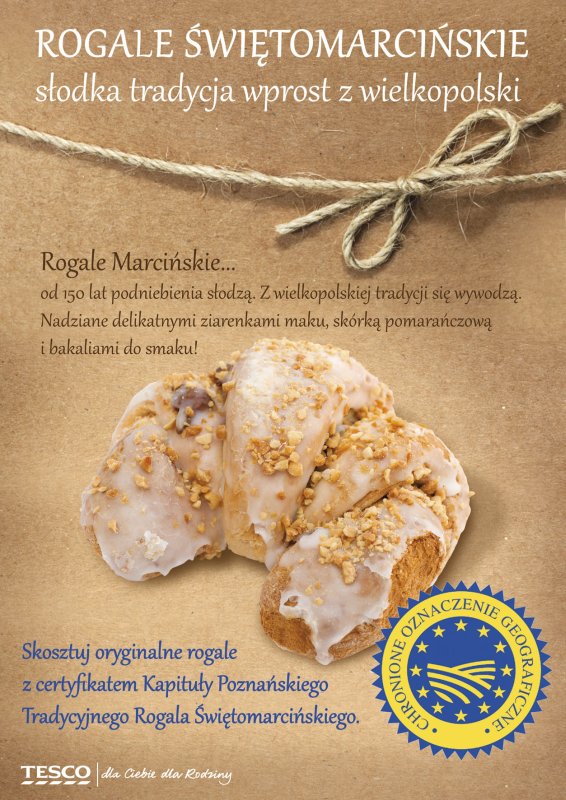 Warto wiedzieć, że nie każdy może wypiekać te tradycyjne słodkości. Oryginalny rogal z ciasta półfrancuskiego wypełnionego makiem i bakaliami, musi być opatrzony certyfikatem Kapituły Poznańskiego Tradycyjnego Rogala Świętomarcińskiego. I to właśnie takie rogaliki od 8.11 do 10.11 będzie mógł kupić każdy klient hipermarketów Tesco. Jeden rogalik zapakowany w wygodny kartonik będzie kosztował 7,99 zł.