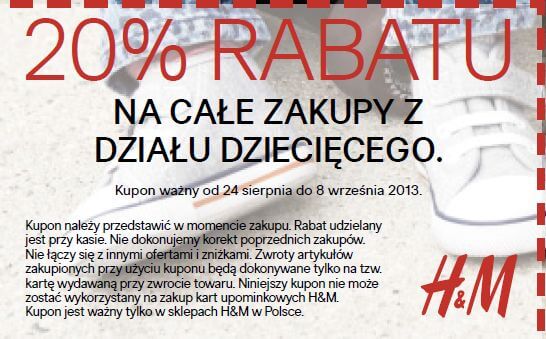 Sklepy H&M zapraszają klientów do skorzystania z kuponu rabatowego. Kupon o wartości 20% dostępny jest na ostatniej stronie katalogu, który znajduje się na stronie internetowej marki. Kupon obowiązuje od 24 sierpnia do 8 września i można go wykorzystać tylko sklepach H&M w Polsce.