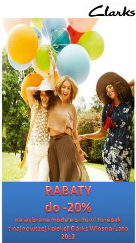 Od 18.05.2012 ruszamy z atrakcyjnymi zniżkami. Wybrane modele butów i torebek z najnowszej kolekcji Clarks wiosna/lato2012 w rewelacyjnych cenach – RABATY nawet do -20%.