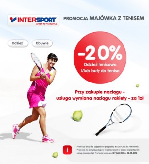 W sklepach Intersport majówka nadal trwa! Z tej okazji w dniach od 27 kwietnia do 13 maja br. na odzież tenisową i/lub buty do tenisa otrzymacie 20% rabatu.