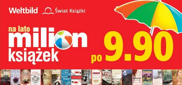 Milion książek po 9,90 zł to hasło przewodnie największej książkowej promocji tego lata. Kampania rozpoczęta 27.06 potrwa do 25.07, obejmuje wszystkie kanały sprzedaży firmy Weltbild – katalog wysyłkowy, sklep internetowy Weltbild.pl oraz sieć księgarń.