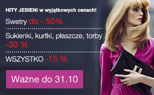 Przytulne, jesienne swetry można kupić nawet do 50% taniej, ciepłe kurtki, eleganckie płaszcze, kobiece sukienki oraz najmodniejsze torby są tańsze o 30%. Na pozostałą część jesiennej kolekcji także przygotowaliśmy atrakcyjne obniżki. Oferta ważna do końca października.
