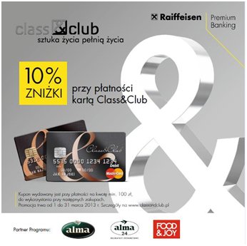Przez cały marzec Klienci Delikatesów Alma płacąc kartą Class & Club banku Raiffeisen otrzymają 10% zniżki na zakupy.