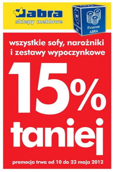 Od 10 do 23 maja 2012 r. wszystkie meble tapicerowane – sofy, narożniki i zestawy wypoczynkowe – będzie można kupić z 15-procentową zniżką. Promocja dostępna w salonach Abry w całej Polsce.