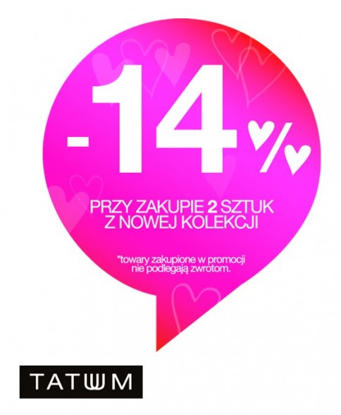 Przyjdź do Tattum w dniach 10-14 luty, a otrzymasz 14% rabatu przy zakupie 2 produktów z wiosennej kolekcji.