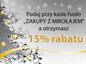 Aby uzyskać 15% rabatu w promocji wystarczy podać podczas zakupów przy kasie hasło „Zakupy z Mikołajem”.
