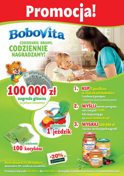Przez cały okres trwania promocji codziennie będzie można wygrać sto kocyków i jeden jeździk dziecięcy. Ponadto, kupujący posiłki w słoiczkach BoboVita mogą liczyć na 20% zniżki na zakupy w salonach sieci Coccodrillo w całej Polsce. Rabat można otrzymać podczas trwania promocji „Codziennie dbamy, codziennie nagradzamy” za każde 10 etykiet ze słoiczków. Uwieńczeniem loterii będzie losowanie spośród wszystkich zgłoszeń nagrody głównej w postaci 100 000 zł. Łącznie uczestnicy promocji mogą wygrać aż 9 091 nagród!