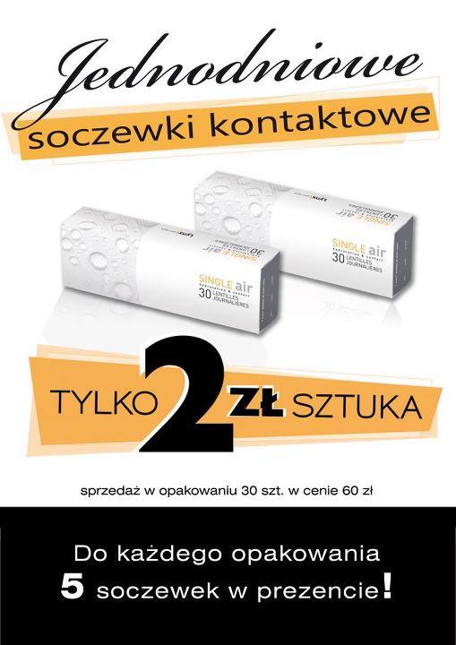W najnowszej promocji w salonach Lynx Optique do każdego opakowania soczewek Single Air otrzymacie 5 sztuk jednodniowych soczewek kontaktowych w prezencie!