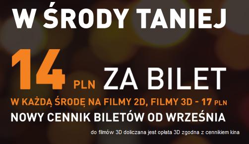 Środa stanie się ulubionym dniem kinomaniaków! Już od 12 września, w każdą środę we wszystkich kinach Cinema City obowiązywać będzie cena specjalna na wszystkie filmy z repertuaru. W środy cena biletu na seanse 2D wynosić będzie zaledwie 14 zł, natomiast filmy w 3D będzie można oglądać za jedyne 17 zł (+ opłata 3D). Kinomaniacy oszaleją ze szczęścia. Jeszcze więcej filmów w specjalnych cenach?! Tylko w Cinema City!