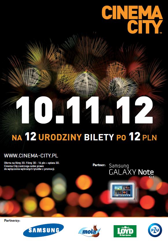 Największe polskie i zagraniczne hity w urodzinowej cenie tylko w Cinema City! W najbliższą sobotę, 10 listopada 2012, bilety na wszystkie filmy 2D kosztować będą zaledwie 12 zł, a seanse 3D obejrzeć będzie można za jedyne 14 zł (plus opłata 3D). Kinomaniaku, przybądź i świętuj 12 urodziny Cinema City w Polsce!
