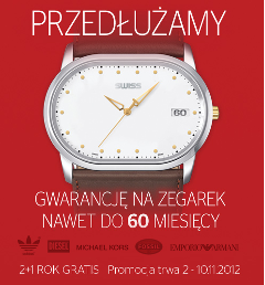 SWISS uruchamia program PRZEDŁUŻONA GWARANCJA Przy zakupie zagarka standardowo gwarancja obejmuje 2 lata. Teraz Klienci przy zakupie zegarków marek: Adidas, Diesel, Emporio Armani, Fossil, Michael Kors, mają możliwość przedłużenia jej nawet do 60 miesięcy.