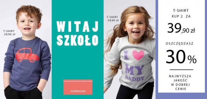 Przy zakupie dwóch t-shirtów za 39,90 zł zaoszczędzisz aż 30%! Koniecznie wybierz się na zakupy do najbliższego sklepu Mothercare i sprawdź ofertę promocyjną.