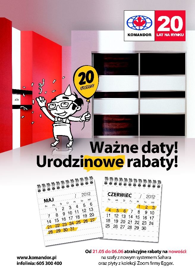 Z okazji 20-lecia firma Komandor przygotowała dla klientów specjalne promocje na płyty z kolekcji ZOOM firmy Egger oraz nową linię szaf Sahara. Rabaty sięgają nawet do 30%.