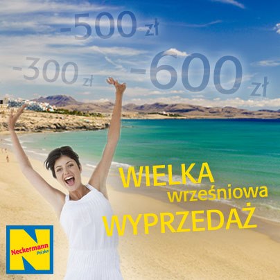 W ramach posezonowej wyprzedaży Neckermann oferuje w wybranych terminach na całą ofertę katalogową atrakcyjne rabaty w wysokości do 600 zł/os. Promocja potrwa do końca września i objęła najpopularniejsze wakacyjne kierunki: Turcję (Riwierę Turecką i Turcję Egejską), Hiszpanię (Costa del Sol, Teneryfę i Gran Canarię), Portugalię, Egipt (Sharm El Sheikh i Marsa Alam) oraz Maroko.