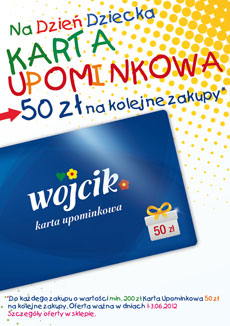 Każdy, kto w dniach 1-3 czerwca 2012 zrobi zakupy za min. 200 zł otrzyma elegancką Kartę Upominkową Wójcik o wartości 50 zł do realizacji przy kolejnych zakupach: