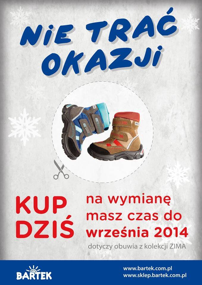 Na ferie Bartek przygotował wyjątkową propozycję, która z pewnością ucieszy niezdecydowanych. Tylko teraz zakupione buty – w przypadku jeśli nie będą noszone – można wymienić aż do września 2014 roku.